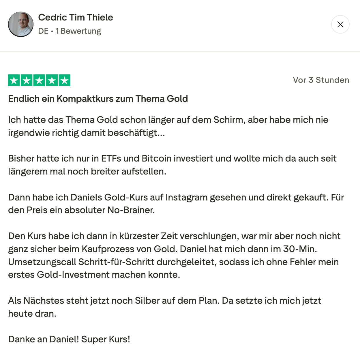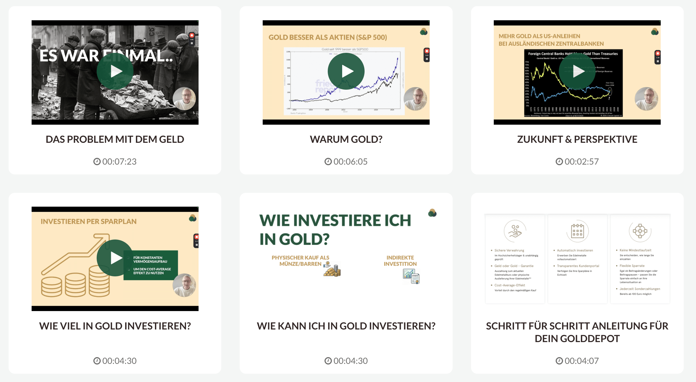 Gold gilt fĂŒr viele Menschen als Grundlage der Vermögenssicherung, gerade in Zeiten von Unsicherheit. Es steht fĂŒr: StabilitĂ€t, Werterhalt, finanzielle Sicherheit durch Sachwerte. Der Kurs hilft dir, dieses Thema informiert und nĂŒchtern einzuordnen. Dieser Kurs ersetzt keine Anlageberatung. Du triffst alle finanziellen Entscheidungen auf eigene Verantwortung.